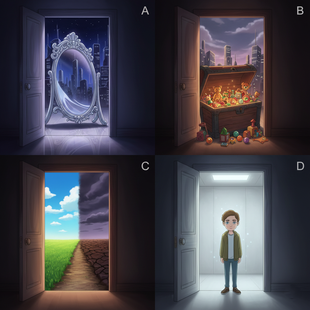 你直觉认为门后是预知未来的镜子,这代表你的内心黑洞源于一种深层的「存在焦虑」。你是一个极度缺乏安全感的人,习惯透过不断的计画、预测与分析来防御未来的变数。对你而言,「未知」本身就是一种威胁。你的黑洞里装满了你对失败的假想、对老去的恐惧,以及对「努力却无回报」的绝望。在现实生活中,你可能表现得非常自律且理性,但这其实是你为了掩盖内心极度脆弱的一种补偿机制。你渴望看见未来,是因为你不敢信任现在。这种对掌握感的偏执,让你活得像一根绷紧的弦,深怕只要一次预判错误,整个人生就会彻底崩塌。你最难以面对的,其实是那个「无法掌控命运」的无能为力的自己。