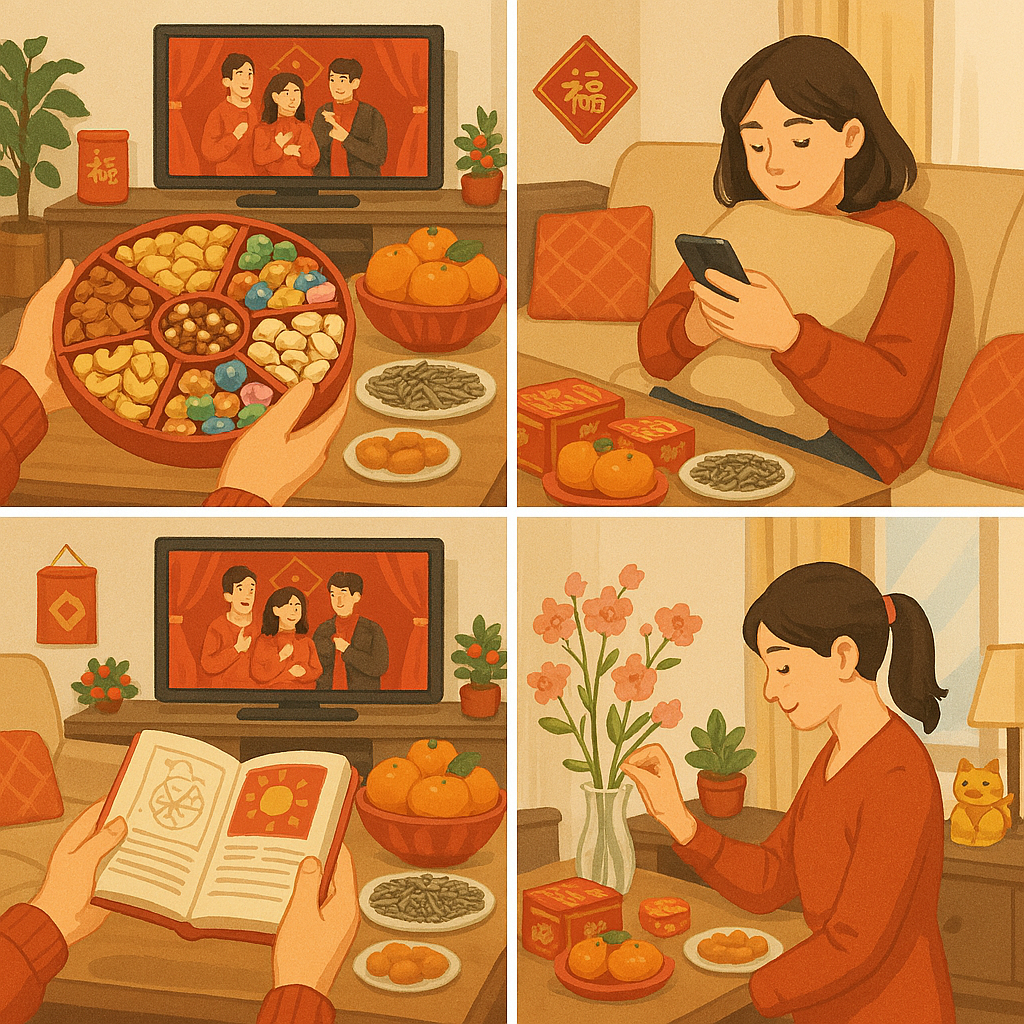 大年初三这天,你决定听从古训待在家里。客厅里摆满了年货,电视正播着贺岁片。请凭直觉,从以下四种行为中选择一种你最想做的事: