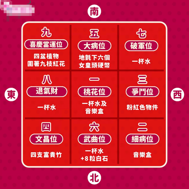 在今年的正西方三碧位,代表是非以及争斗位,师傅建议可以摆放粉红色物件来化解争吵和是非。全屋正中间的中宫是今年的桃花位,可以摆放一杯水旁边加一个音乐盒,閒时扭动音乐盒让声音震动水杯,便可催桃花以及提升人缘,而如果是已婚者,则只放一杯水即可,就可利人缘。