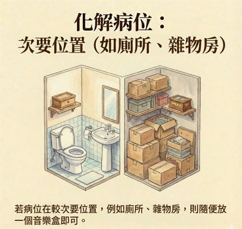 如果病位刚好在大门或厨房,会影响全家人,在门口建议放置灰地毡,在地毡下方放置六个硬币,横排四个,左右各一个,人头像向上;如果是厨房(有火气),除了上述物品,还要在门旁或炉灶旁加放一个音乐盒。而如果在房间,则只影响住在该房的人,就建议在床褥下或床板上黏贴六个硬币(摆法同上),上面用灰色卡纸或毛巾盖住,床头旁边再放置一个音乐盒。而假设位置只在较次要位置,例如厕所、杂物房,则随便放一个音乐盒即可。