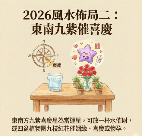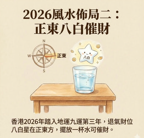 香港在2026踏入地运九运的第三年,而退气财位八白财星,在今年的正东方,可以摆放一杯水来催财。而今年的东南方九紫为喜庆星及当运星,除了可以摆放一杯水催财之外,亦可以摆放四盆植物围著九枝红花,这对催姻缘、喜庆事或怀孕都有帮助。另外在西南方七赤位,亦可摆放一杯水,化解贼星,并希望能起到间接催财的作用。