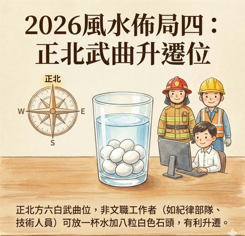 在2026年的正北方,是六白武曲位,如果是从事文职以外职业,例如纪律部队、装修工人、电脑技术人员、司机等非主要靠北物工作的行业,可以在正北方摆放一杯水,内放八粒白色石头,便有利于文职以外的升迁。