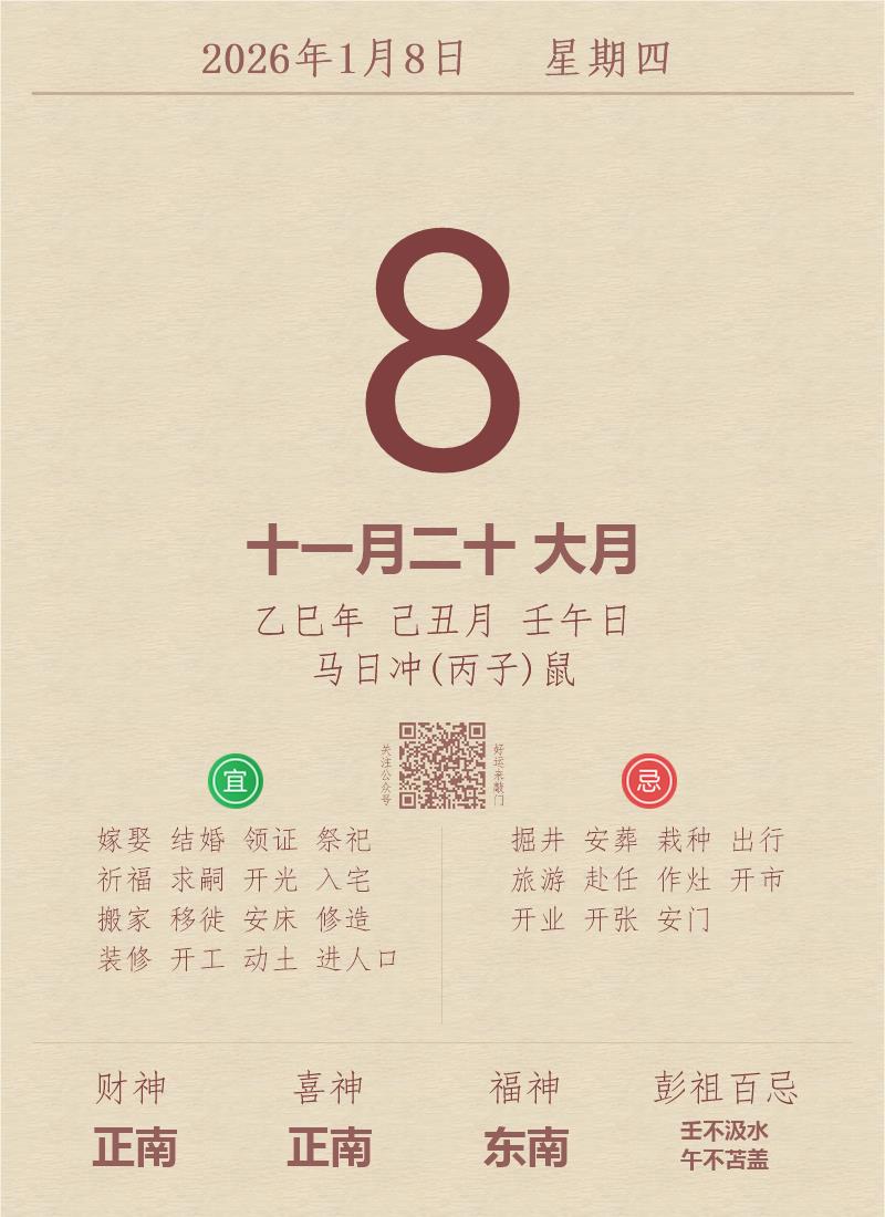 今日老黄历(2026年1月8日):黄历宜忌、财神方位、特吉生肖、打麻将财位