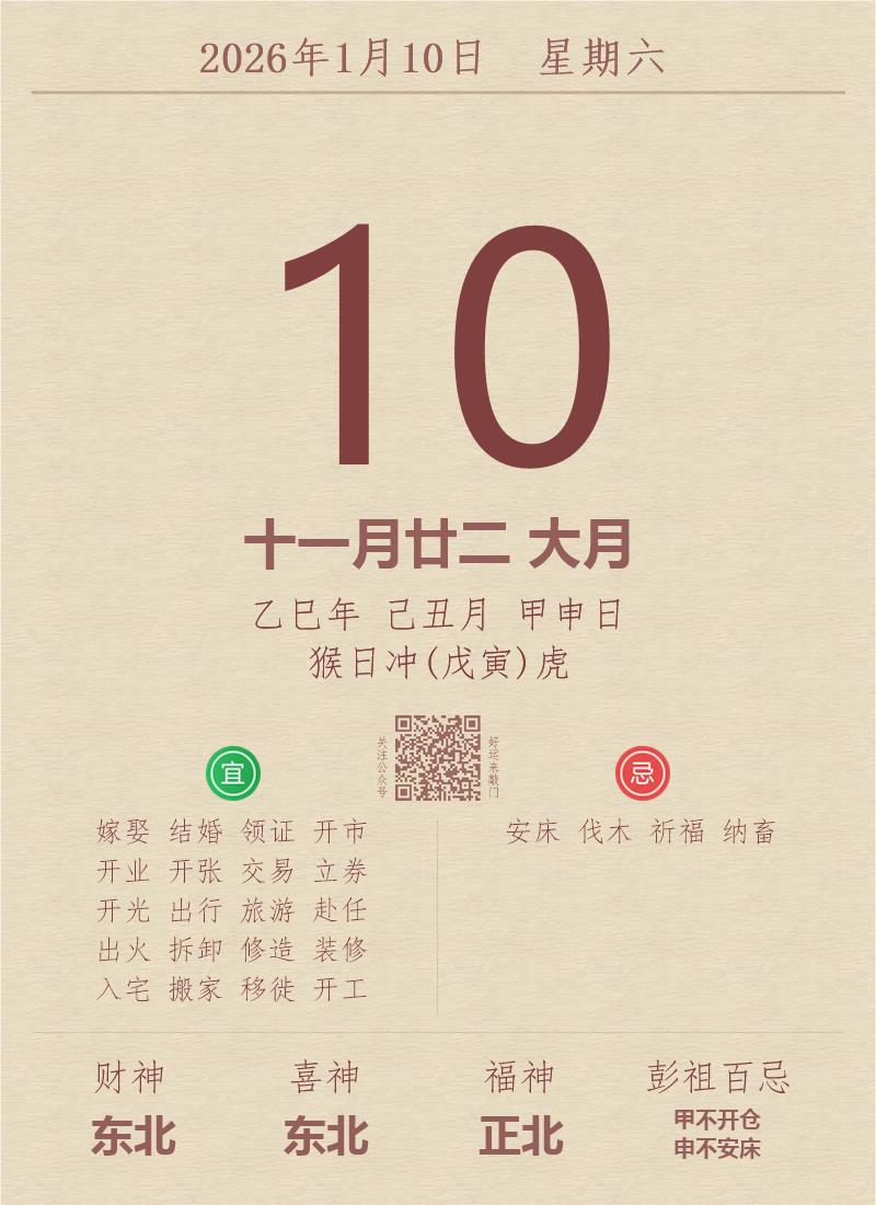 今日老黄历(2026年1月10日):黄历宜忌、财神方位、特吉生肖、打麻将财位