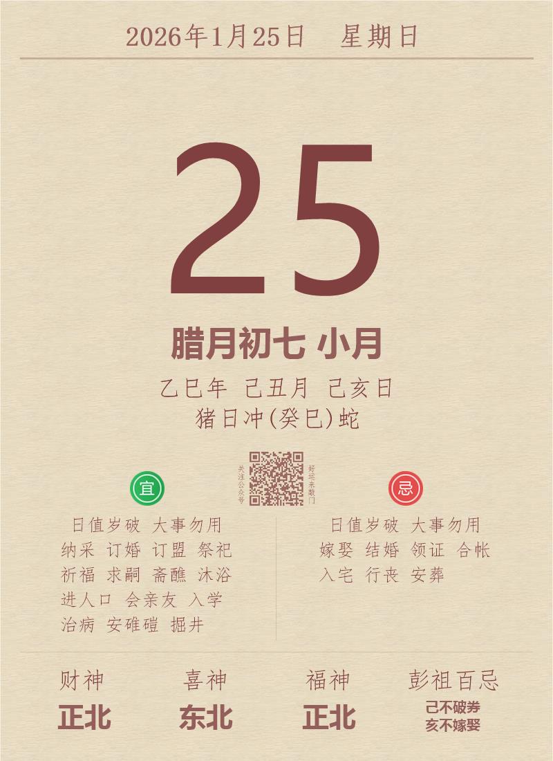 今日老黄历(2026年1月25日):黄历宜忌、财神方位、特吉生肖、打麻将财位