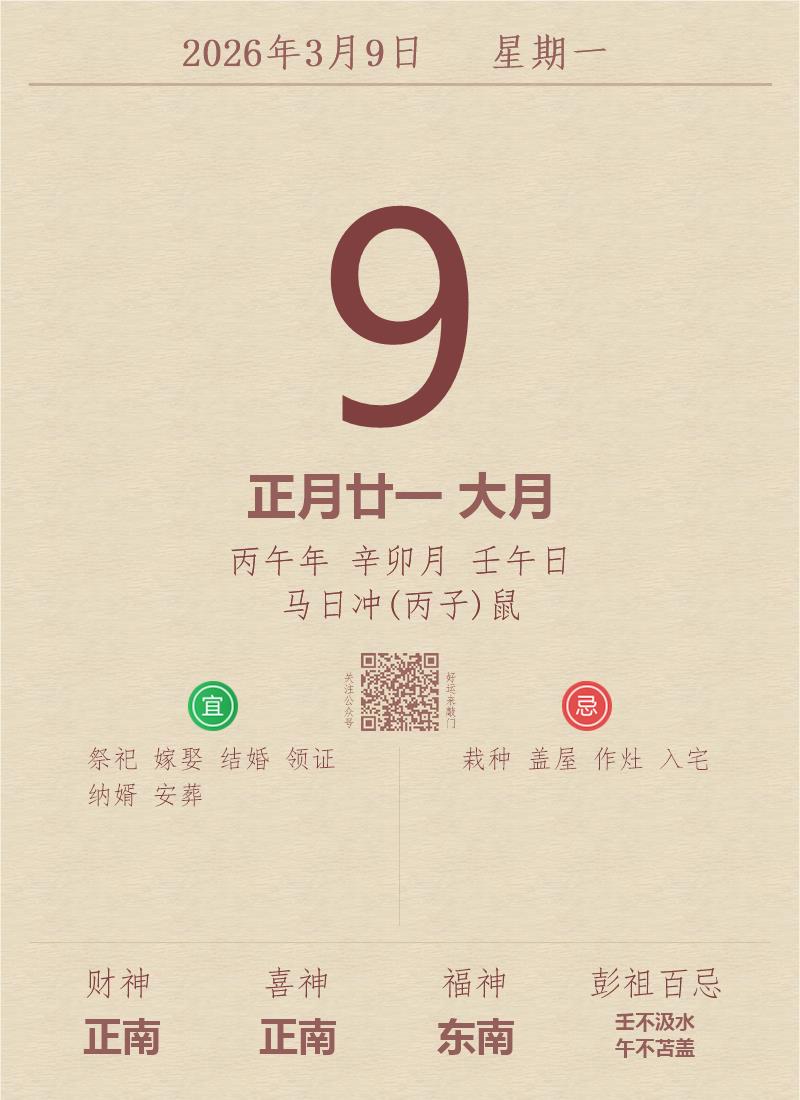 今日老黄历(2026年3月9日):黄历宜忌、财神方位、特吉生肖、打麻将财位