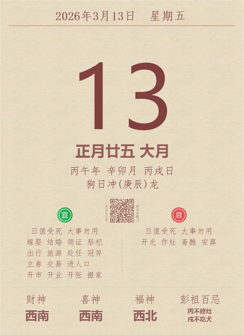今日老黄历(2026年3月13日):黄历宜忌、财神方位、特吉生肖、打麻将财位