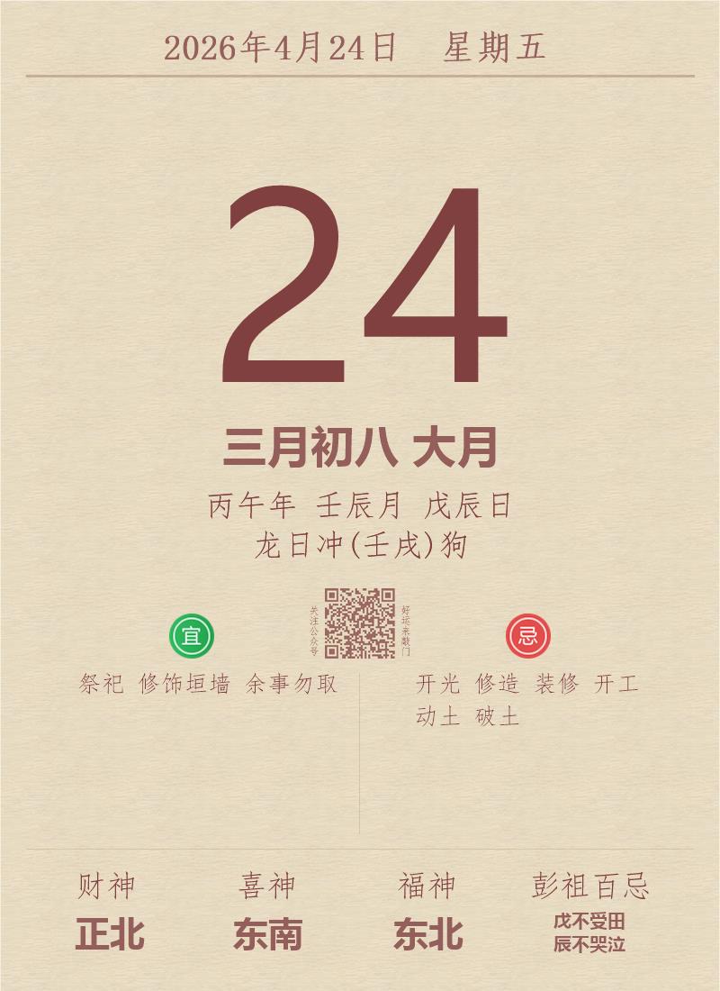今日老黄历(2026年4月24日):黄历宜忌、财神方位、特吉生肖、打麻将财位
