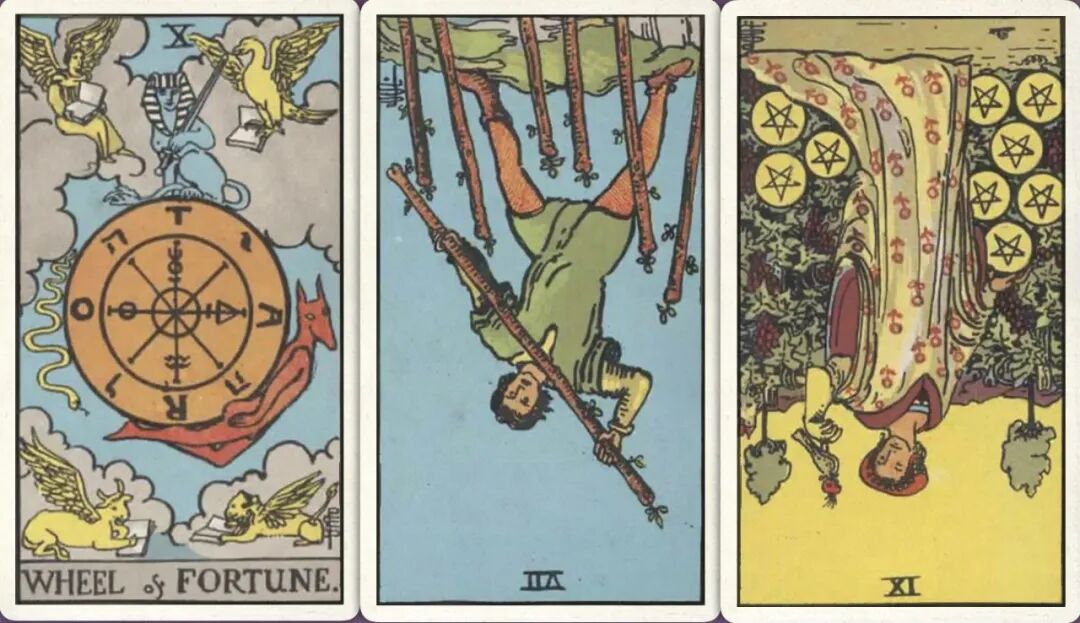 牌:命运之轮+ 权杖七- 星币九-