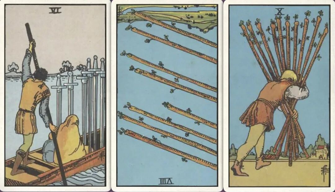 牌:宝剑六+ 权杖八- 权杖十+