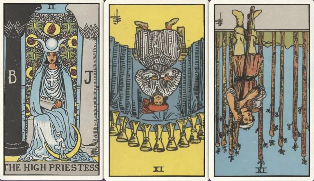 牌:女祭司+ 圣杯九- 权杖九-