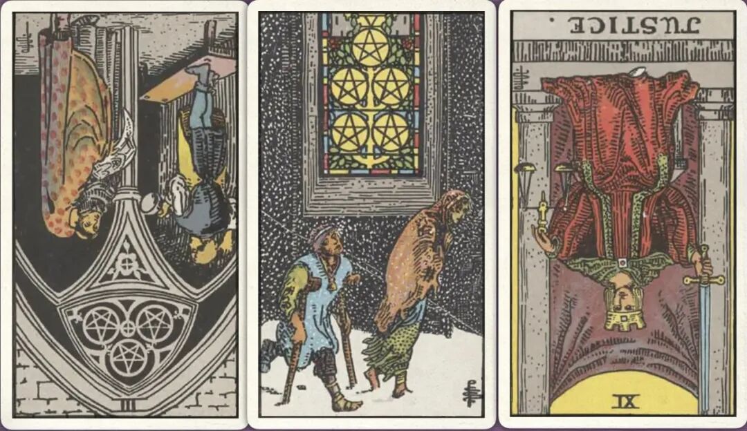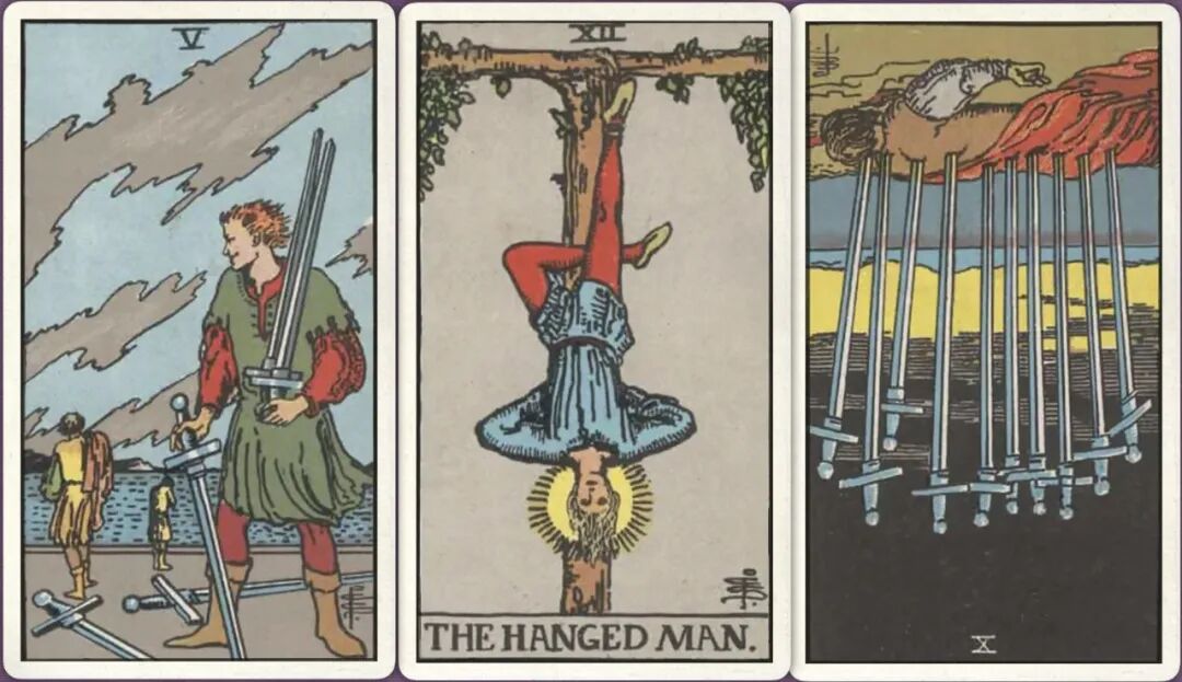 牌:宝剑五+ 倒吊人+ 宝剑十-