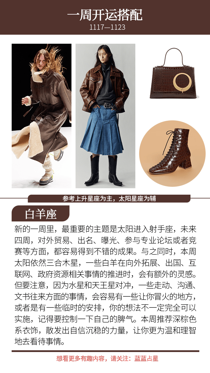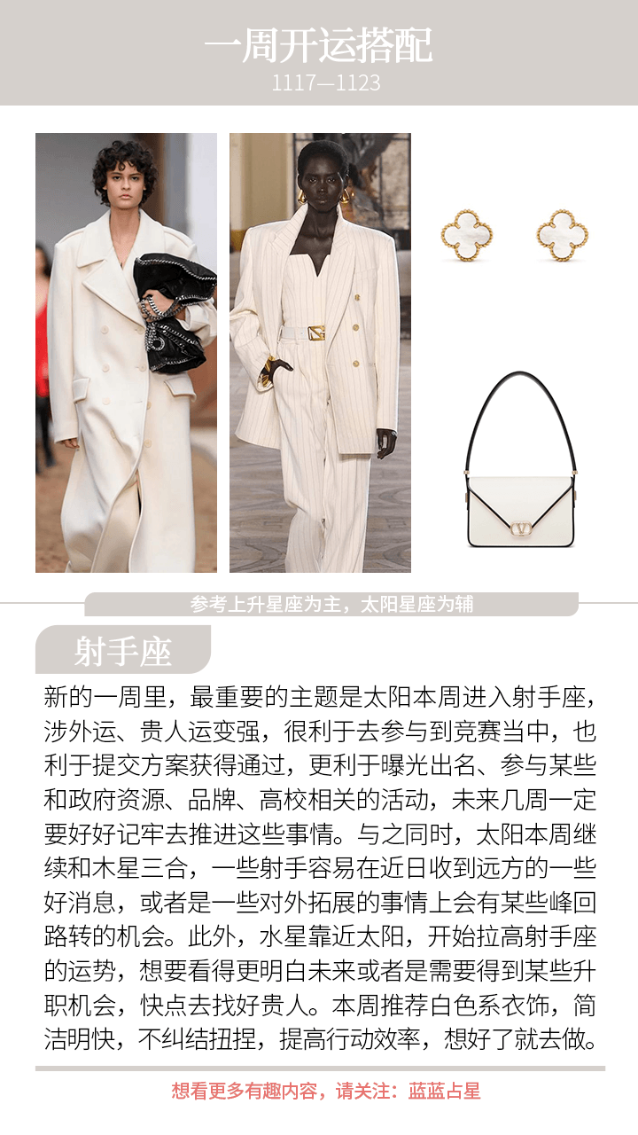 另外,本周太阳回到射手座,射手们期待的好消息要来了——太阳作为射手君的一等贵气星,它的到来将带来极强的贵人力量,未来四周大利考试、升职、涉外、旅游、传播、推广、出国、涉足政府/互联网/高校/贸易资源等。生日快乐,大射手!