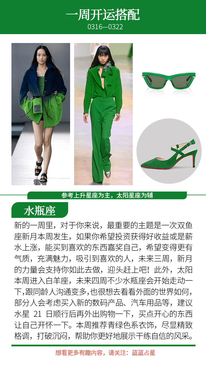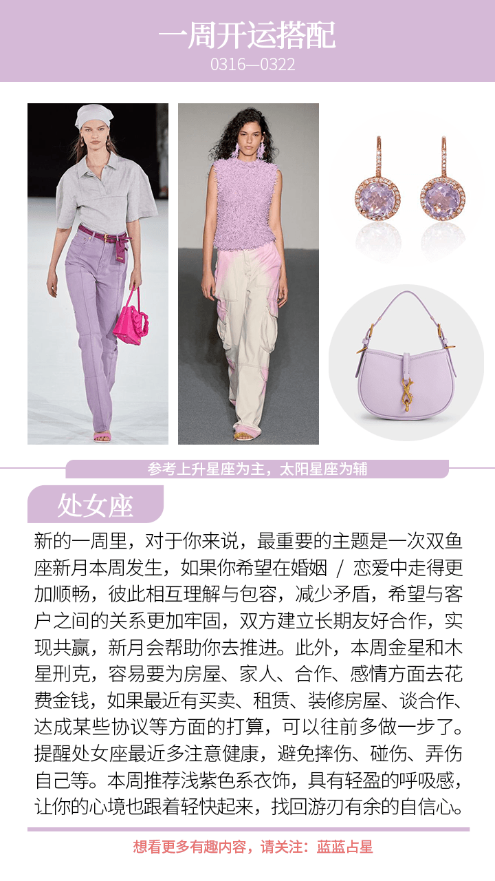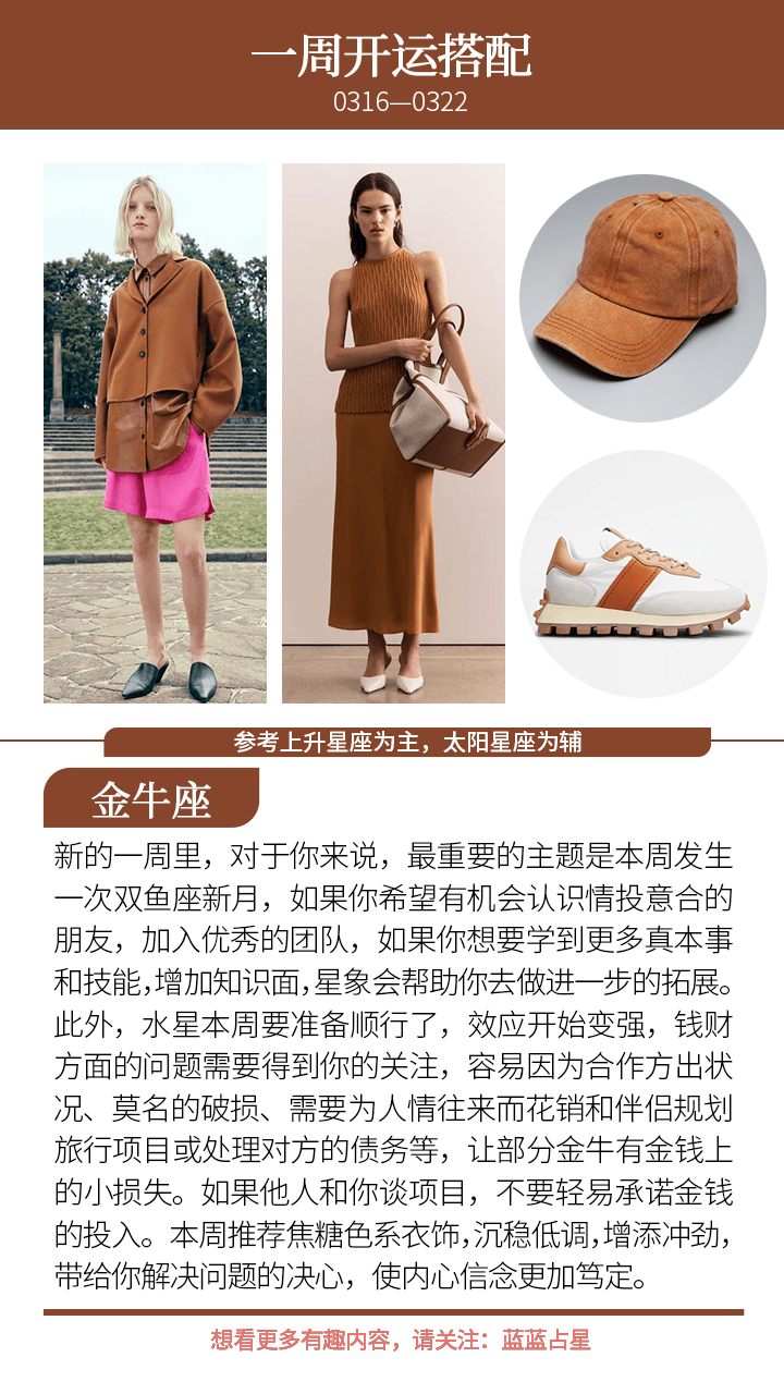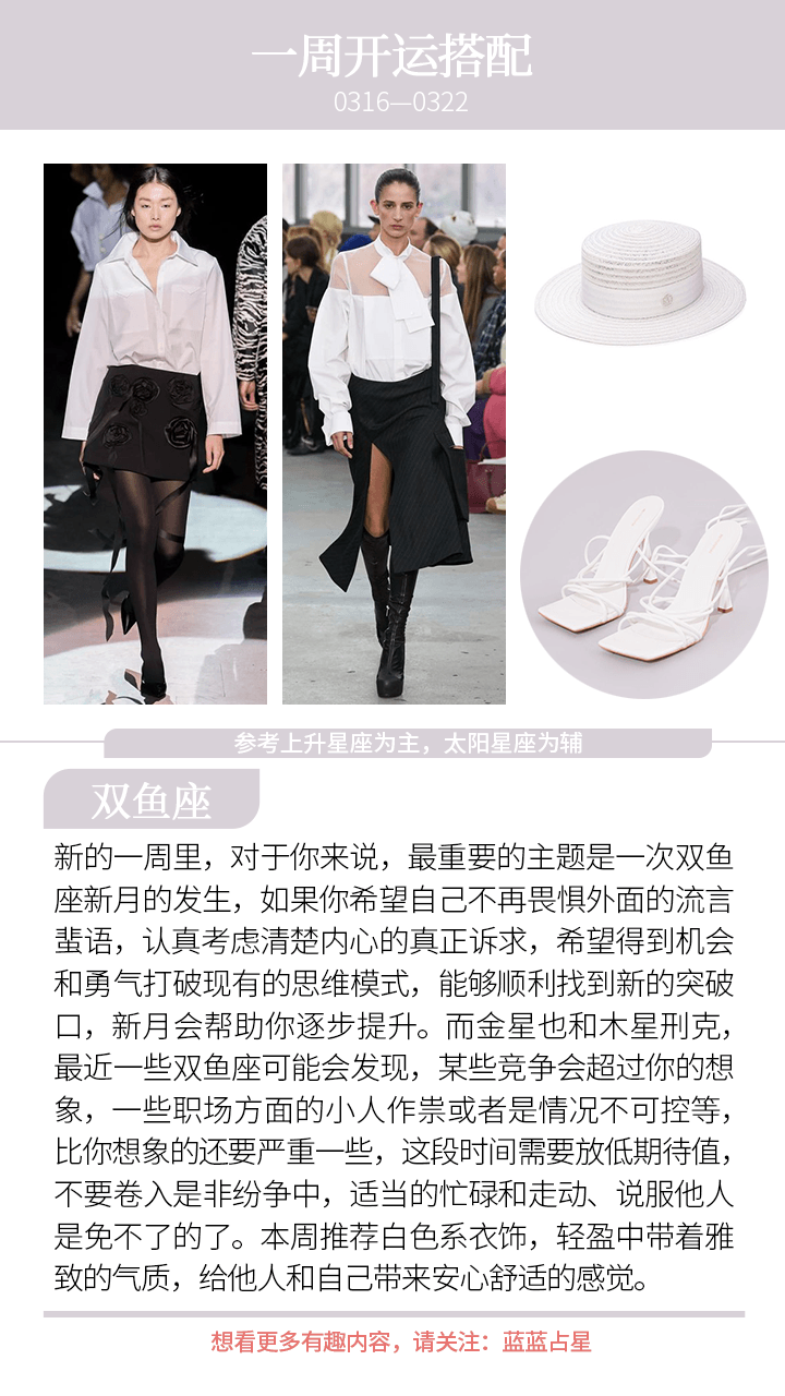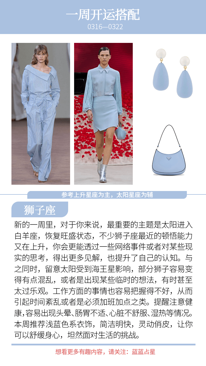 但要注意,因为本周太阳会合海王星,(上升星座或太阳星座)狮子、双鱼也容易有点异想天开或者是突发奇想。但本周需要的是稳稳地做事,不用焦虑太多,把压力当作动力,会更利于你展示个人能力,挖掘出新的能量。
